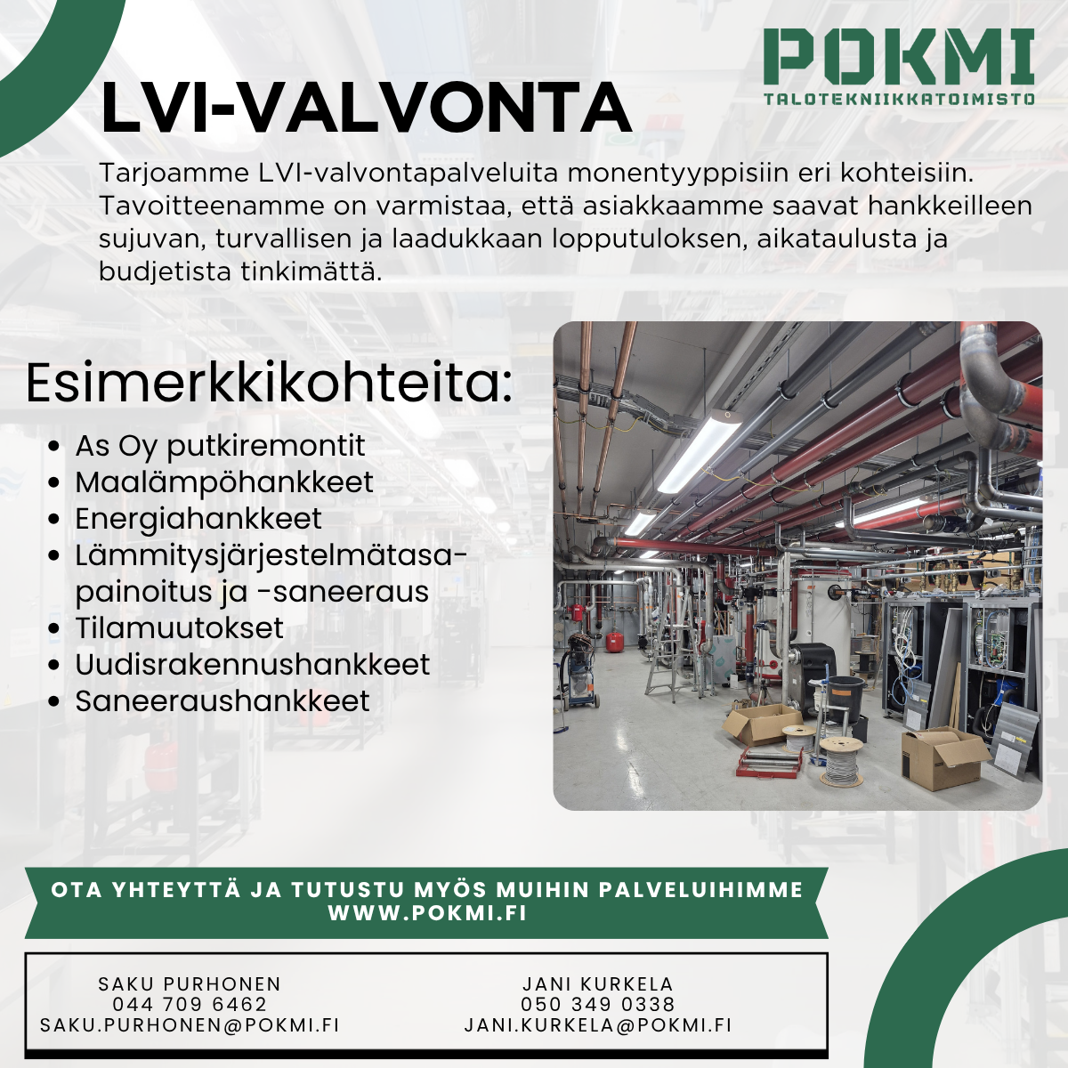 - Uudis- ja saneerauskohteiden LVI-urakoiden töiden valvonta, kerrostalot, koulut, päiväkodit, liike- ja toimitilarakentaminen, teollisuus, hallit